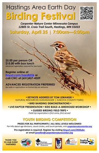 Celebrate birds and conservation at the CNC MN Campus. Attend classes that introduce you to raptors, birding, bird banding, and go on guided bird trips through the Hastings area. Click here to register for the Birding Festival.